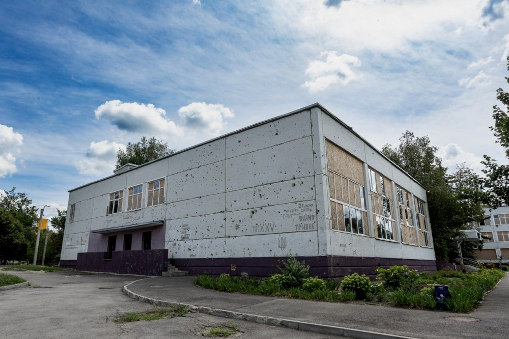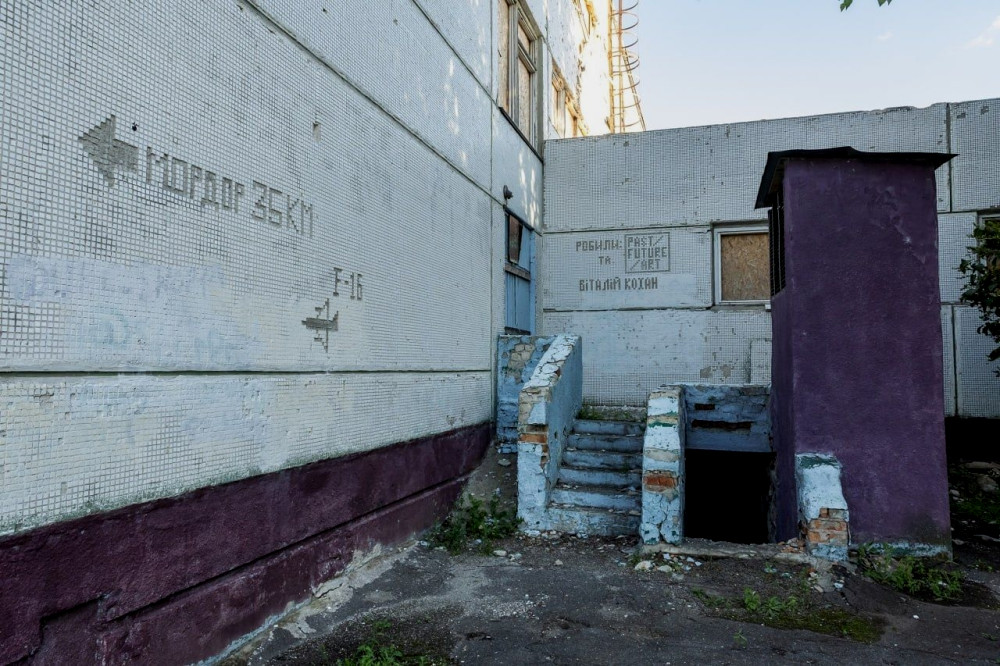 In 2022, the Russian army damaged all buildings in Saltivka. Some structures are being restored, while others will be demolished. School No. 165 has repeatedly suffered from Russian attacks. After engaging with local residents and visiting Saltivka, Vitaliy Kokan decided to create this work specifically on this school.