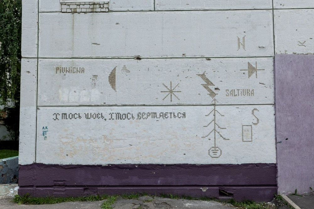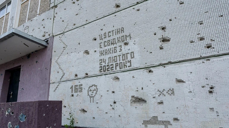 On the wall, he left messages: "This wall bears witness to the horrors of war since February 24, 2022", "Mordor - 35 km", "F-16", "But some didn't leave". These words are complemented by illustrations: a car, a cat, a trident, a diode, a fruit plate, a pistol. Vitaliy Kokan created this piece using his own invented "font", which he conceptualized ten years ago in Kharkiv, chiseling small square tiles from a damaged facade.