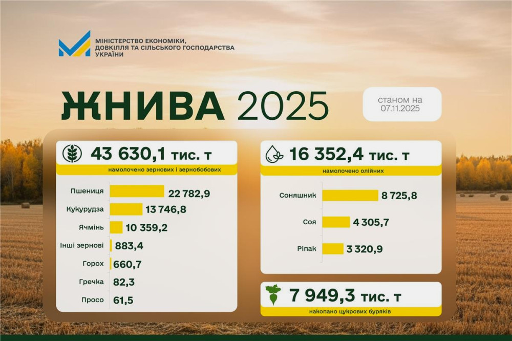 As of November 7, Ukraine has harvested 43.630 million tons of grains from 9.302 million hectares, with 81% of the area harvested. This information is reported by the Ministry of Economy, Environment and Agriculture.