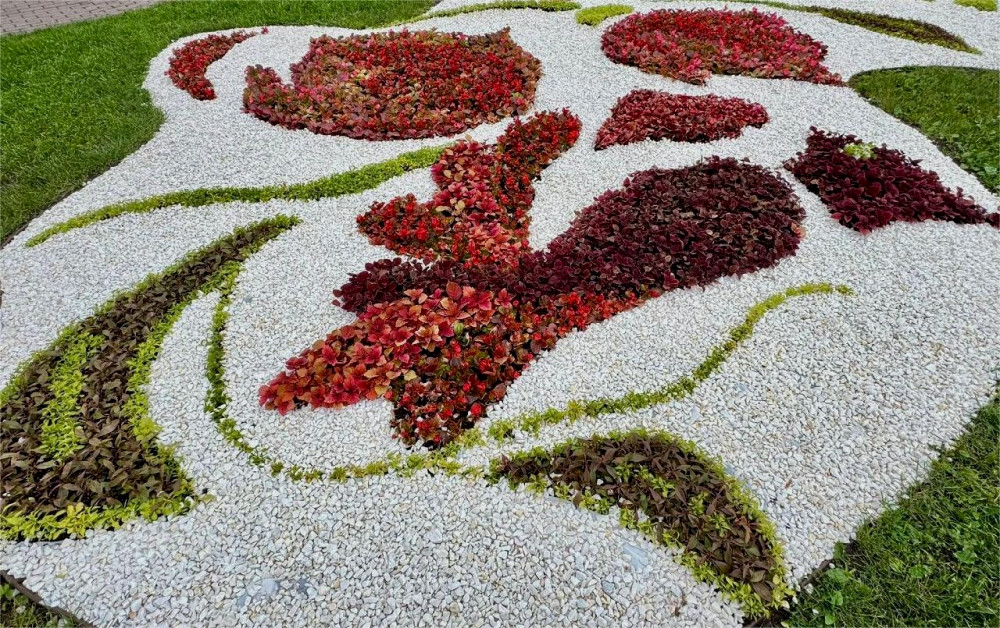 Several plant species have been planted as part of the decoration, each playing a vital role in the overall concept. Begonia adds tenderness to the composition with its lush flowers in warm tones. Alternanthera creates bright accents with its rich red and burgundy leaves, reminiscent of traditional Ukrainian patterns. Coleus, in turn, complements the overall color palette with contrasting combinations of green, yellow, and purple hues.