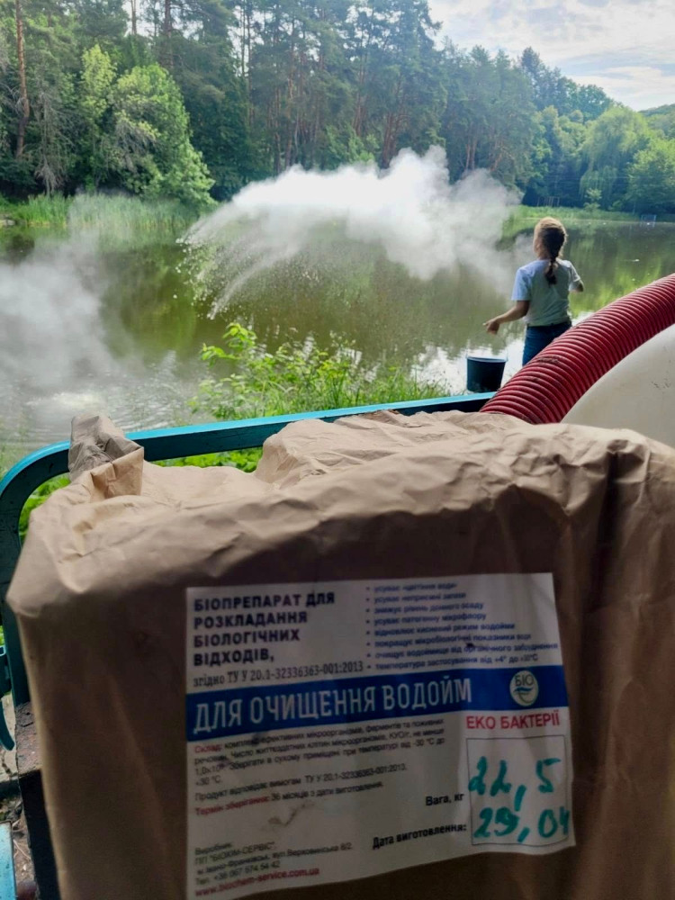 As explained by the Holosiivskyi District Utility Company, the biodestructor is a natural, effective biopreparation based on beneficial microorganisms and enzymes for purification and restoration of the ecological balance of water bodies, also: