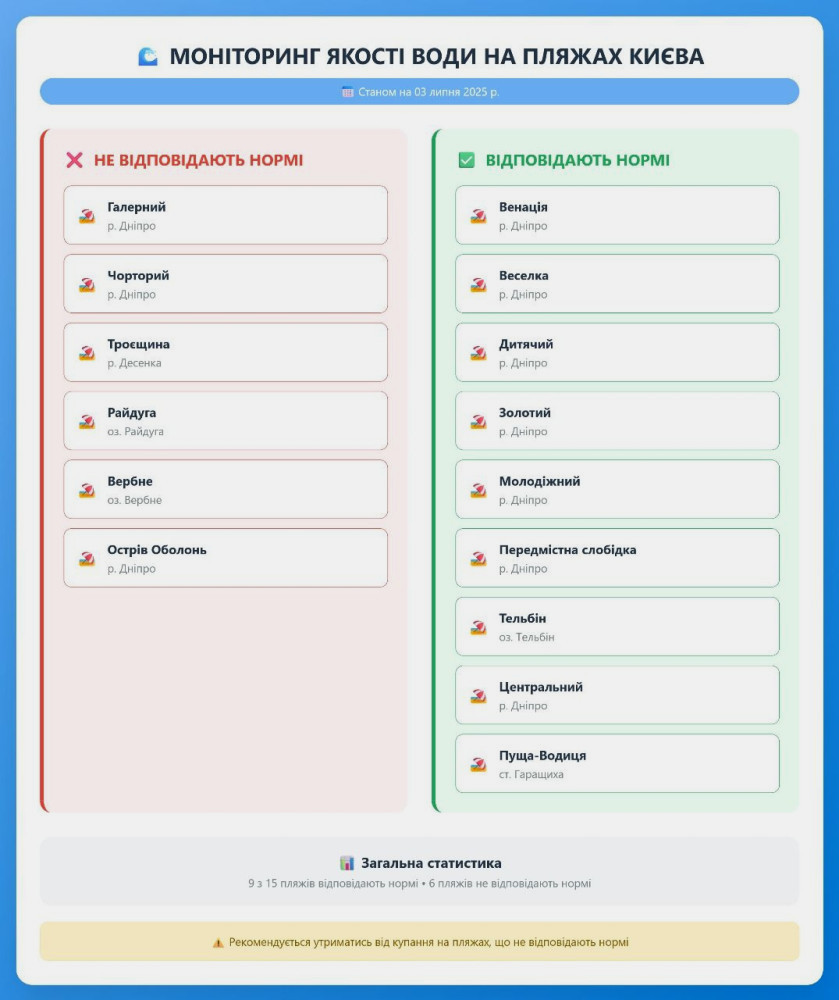 The Kyiv City Center for Disease Control has also released a list of beaches where water quality meets or does not meet standards.