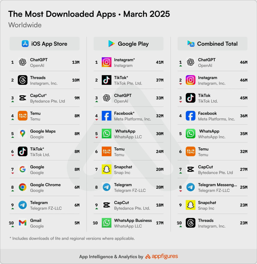 In March, social apps Facebook and WhatsApp also made it to the top five downloads, while others like Temu, CapCut, Telegram, Snapchat, and Threads entered the top ten.