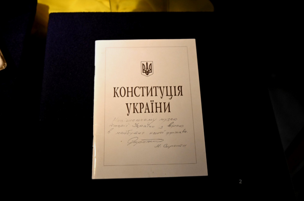 Among the exhibits are the pen used to sign the Law on the Implementation of the Constitution, an ink pot, a Constitution with a personal inscription from Mykhailo Syrota, his laptop, and many other important artifacts.