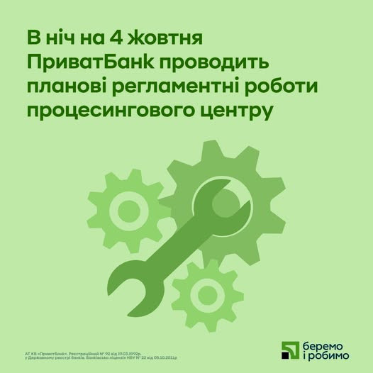 PrivatBank has announced scheduled maintenance during the night of October 4th. Card operations, ATMs, and terminals will be temporarily unavailable.