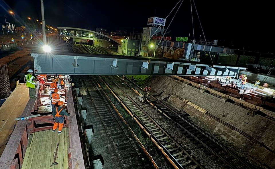 Наразі ведуться роботи з встановлення нових балок між опорами 1 та 2 над лінією метрополітену.