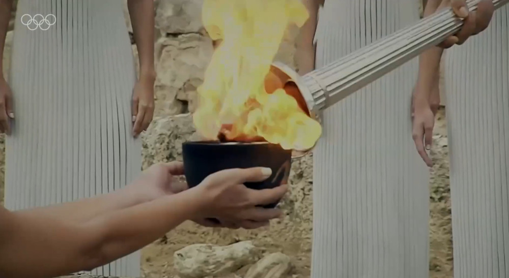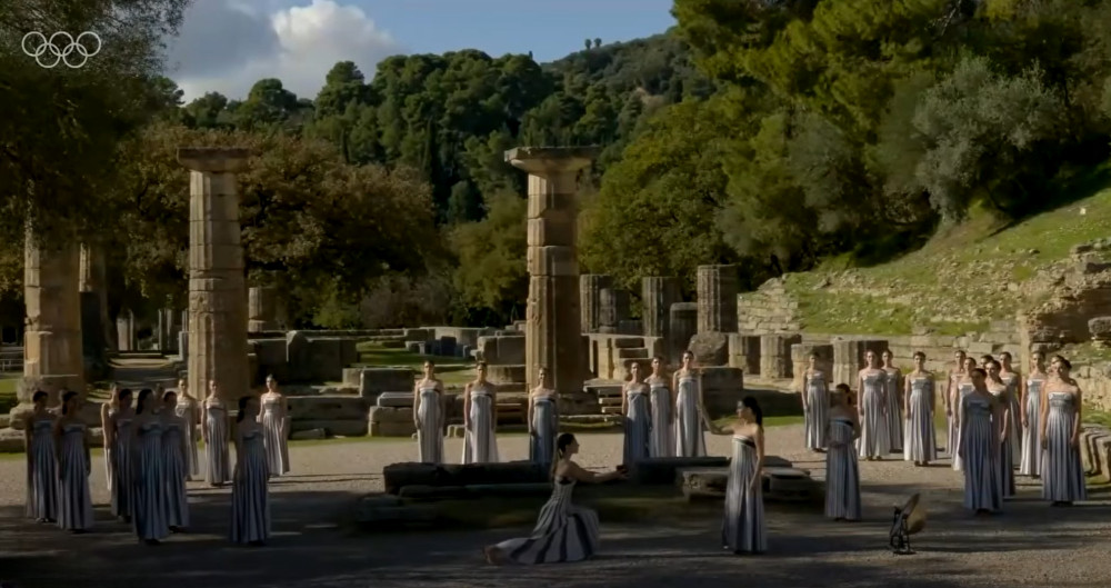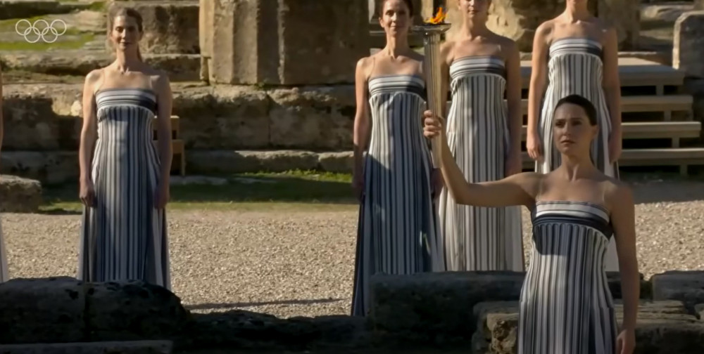 Згідно з давньою традицією, церемонія пройшла у священному місці, де понад три тисячоліття тому розпочалися Олімпійські ігри. Перед храмом Гери жриця, роль якої виконала акторка Мері Міна, звернулася до Аполлона з проханням про світло. Використовуючи параболічне дзеркало для збору сонячних променів, вона запалила полум’я, що стало символом чистоти, миру та вічності олімпійського духу.