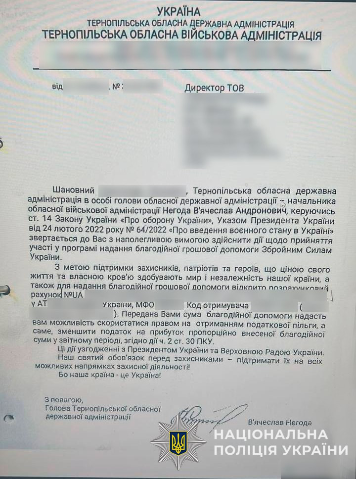 З метою підвищення довіри злочинці виготовили підроблений документ з підписом керівника однієї з обласних військових адміністрацій та створили фейковий телеграм-акаунт.