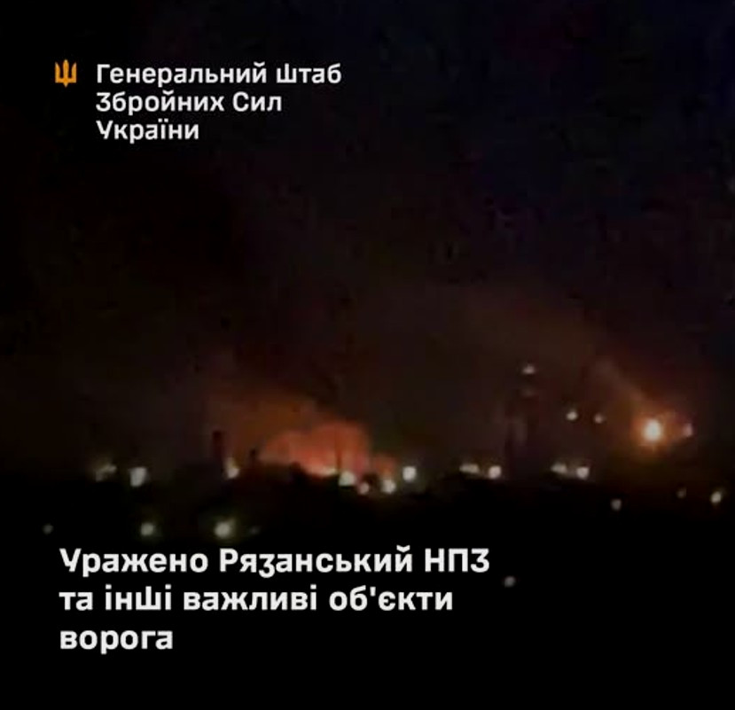 Сили оборони України завдали удару по стратегічним об'єктам, включаючи нафтопереробний завод “Рязанський” та радіолокаційну станцію “Небо-У”. Про це повідомив Генштаб Збройних Сил України у Фейсбуці.